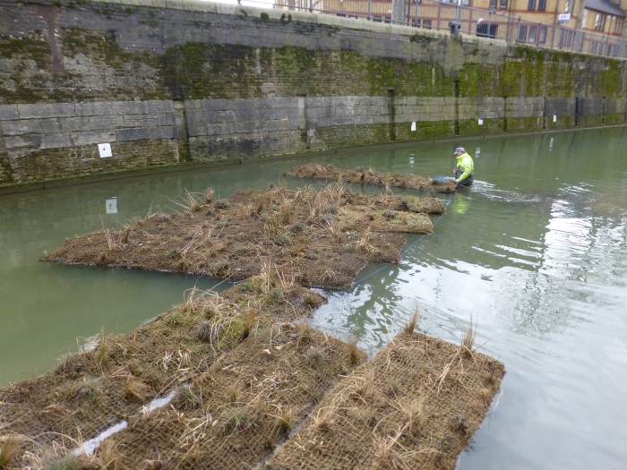 A total of 55 rafts, each 4×2 metres in area, were installed. Most of the rafts were placed along the southern edge of the canal at Spirit Quay, between Vaughan Way and the steps opposite the junction of the two branches of the canal, a distance of about 200 metres. Further rafts were installed around the Tobacco Dock area to extend and supplement the planting from 2015.
